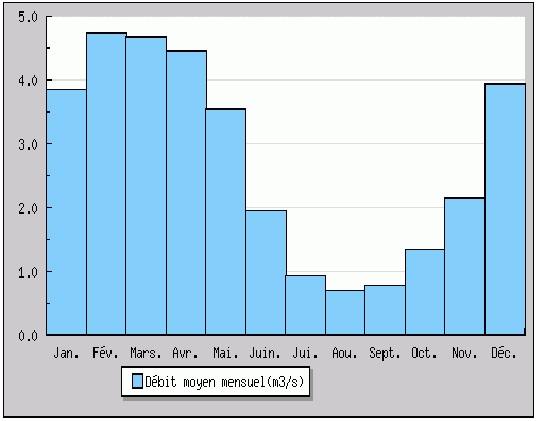 L’Agly présente les fluctuations saisonnières typiques d’un régime pluvial méridional. Les hautes eaux se situent en hiver et au printemps (de décembre à mai). Elles sont suivies d’une chute rapide du débit jusqu’à la période de basses eaux de fin juin à début octobre. En cas de période sans pluie, le fleuve peut aussi tomber à sec. |